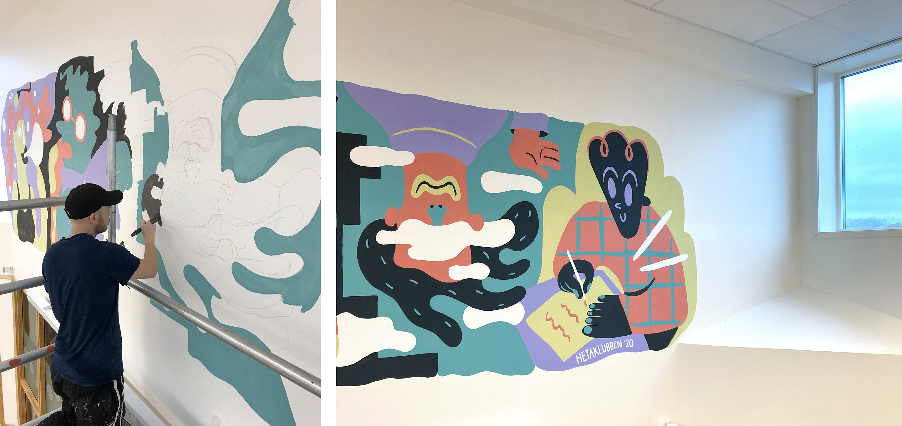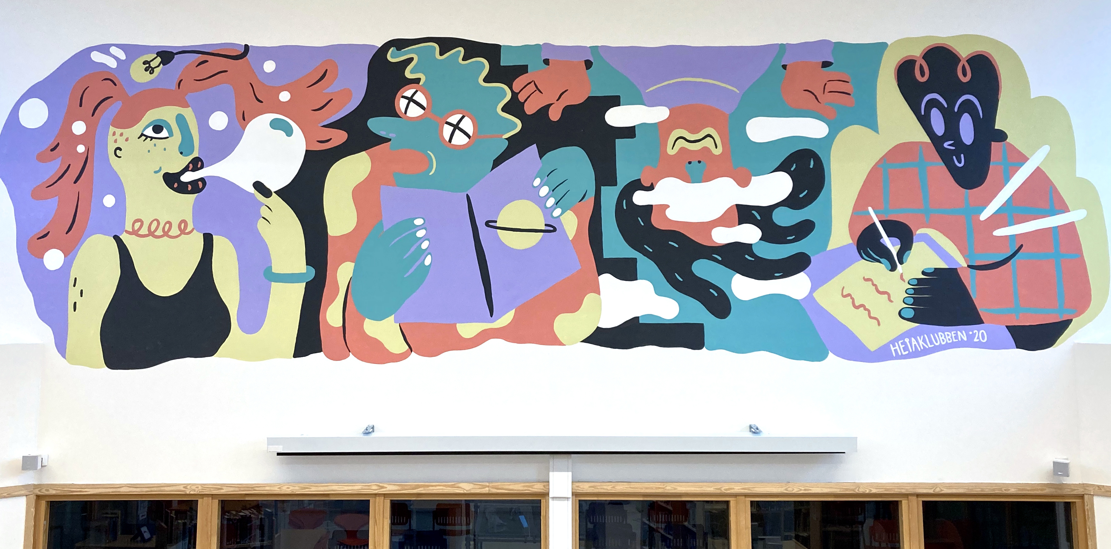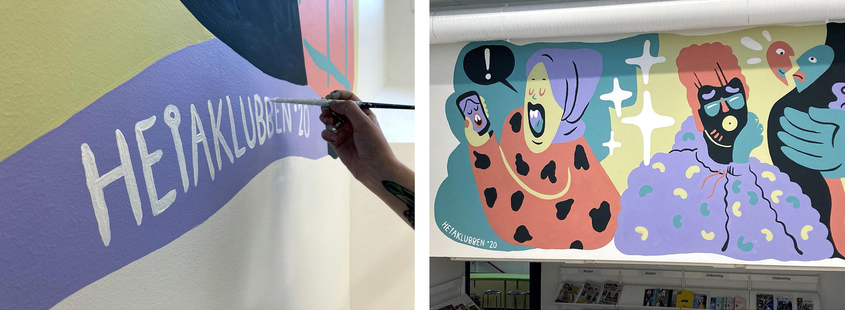To veggmalerier til biblioteket på Dønski videregående skole i samarbeid med Helene Brox.