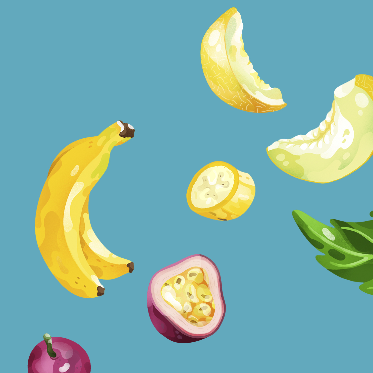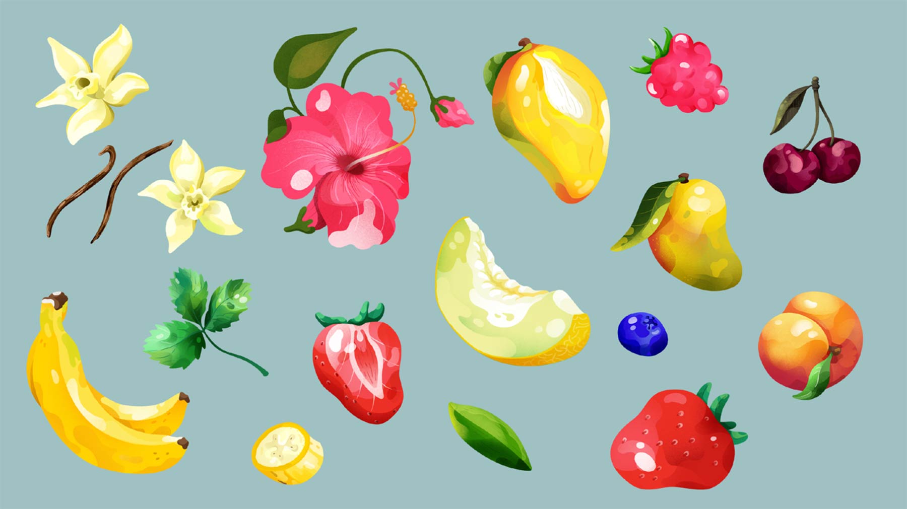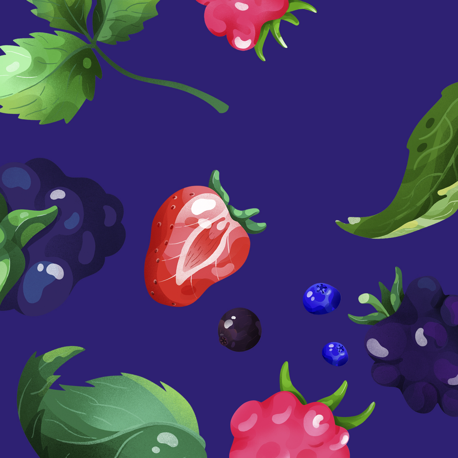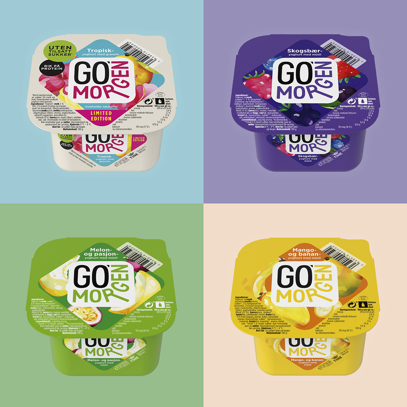 Fargerik frukt, blomster og bær til Go’morgen® yoghurts pakninger.