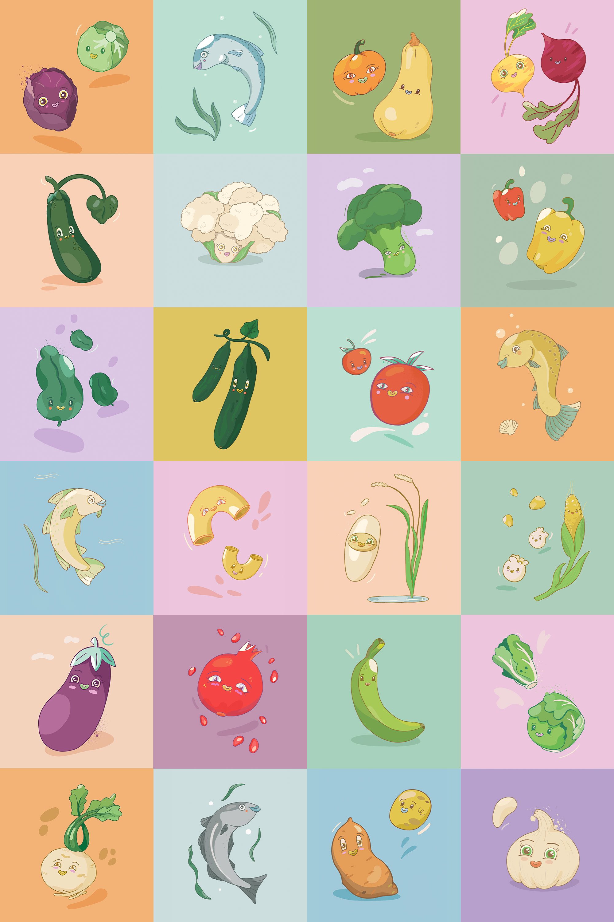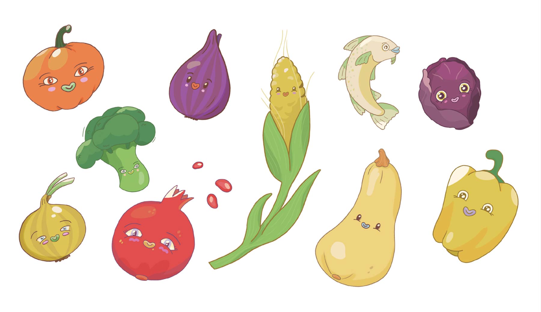 Morsomme og søte illustrasjoner til informasjonskort om sunn mat til barnehagebarn.