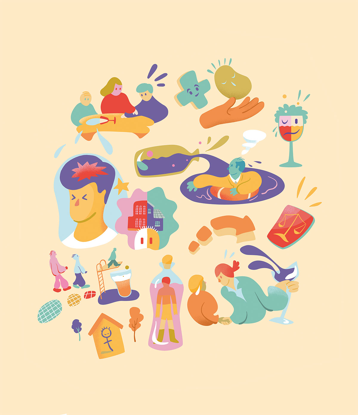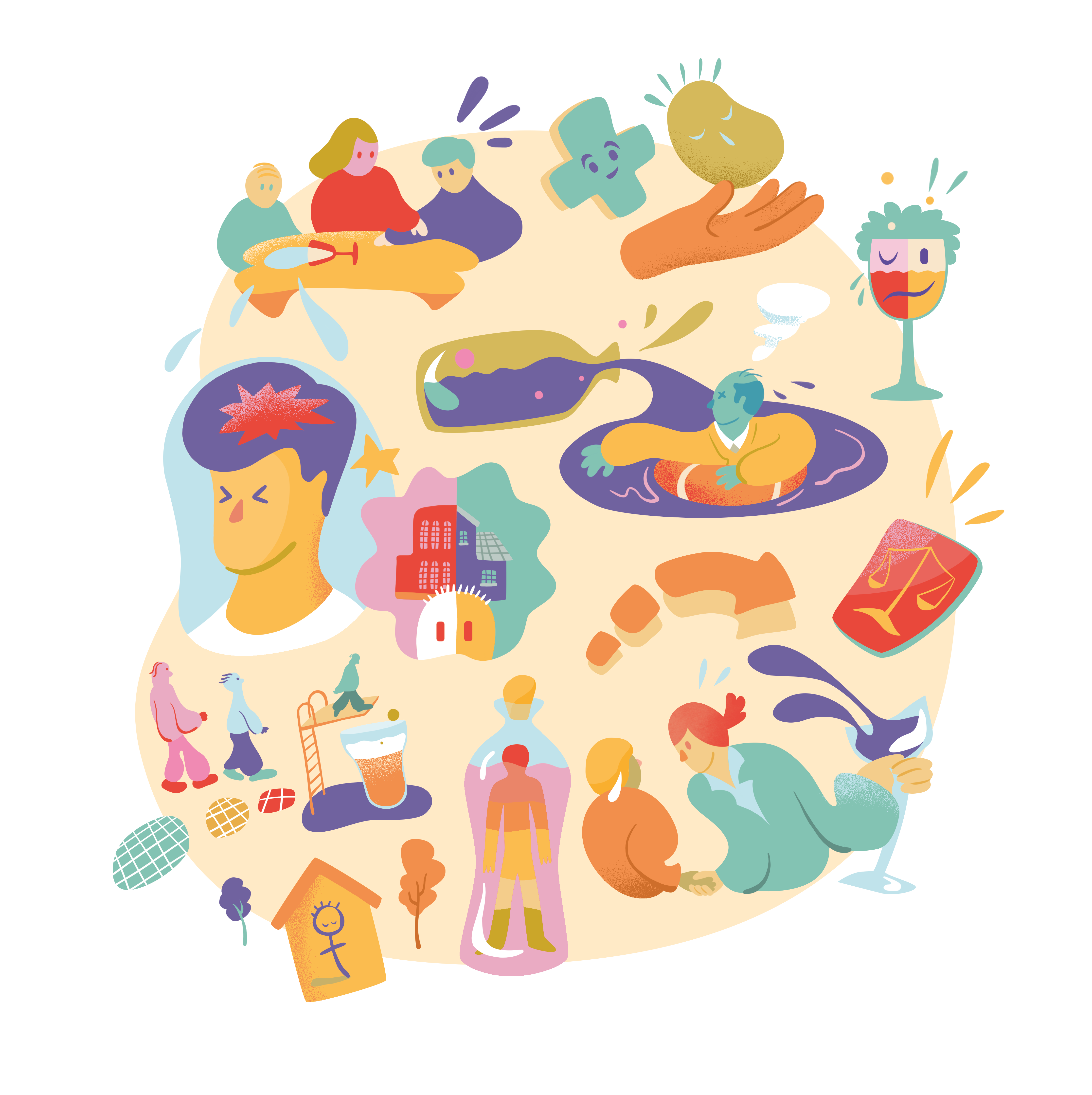 Illustrasjoner til forskningsverktøy om alkoholforbruk i arbeidslivet.